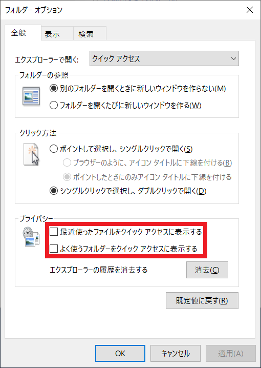 - [全般] タブをクリックし、[最近使用したファイルをクイック アクセスに表示する] および [頻繁に使用するフォルダーをクイック アクセスに表示する] オプションのチェックを外して、[OK] または [適用] をクリックします。