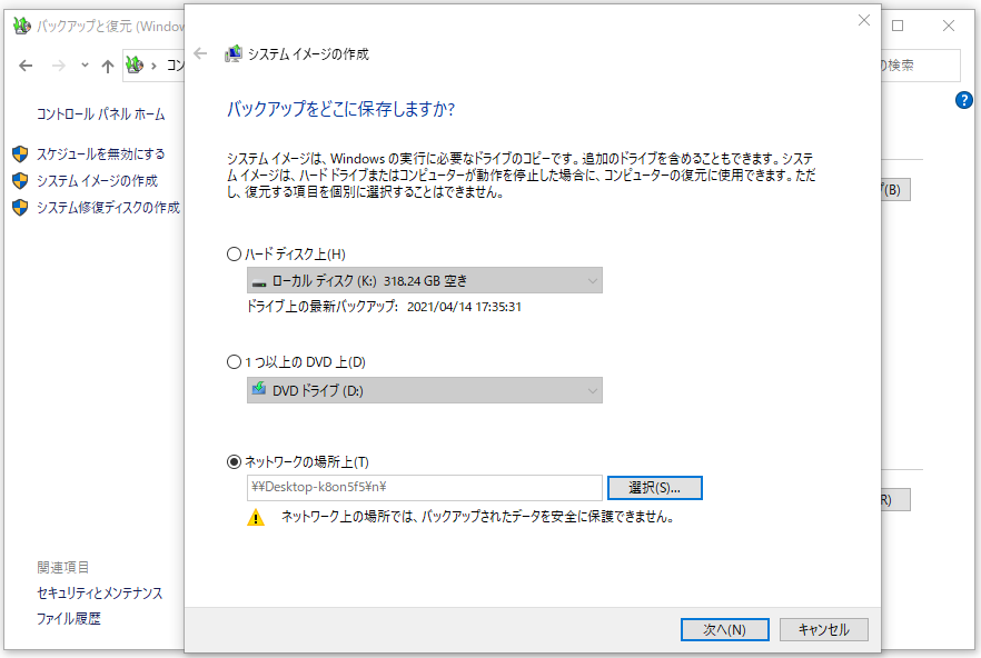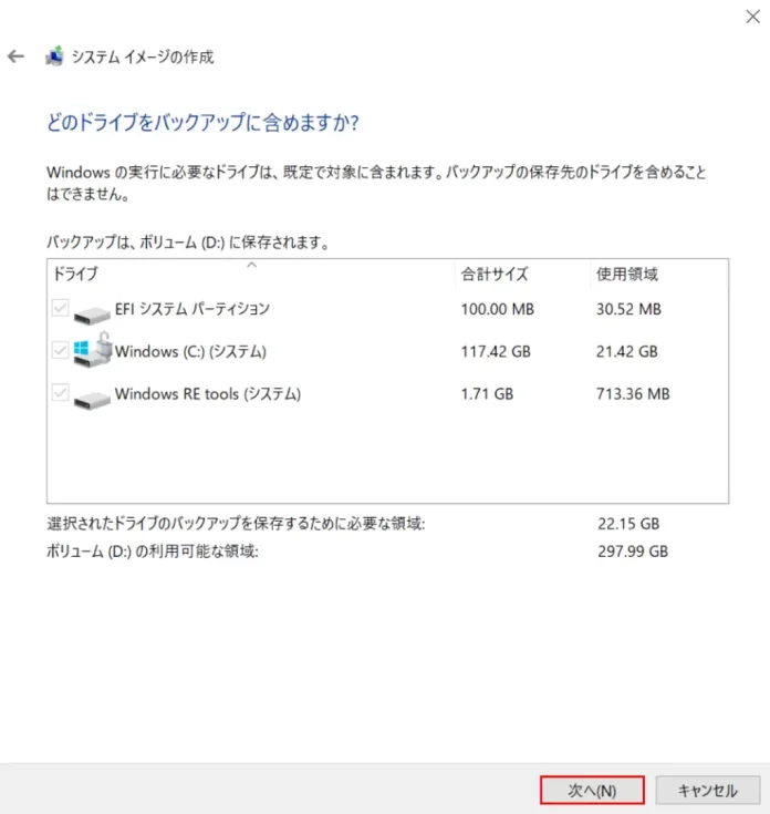 - バックアップが必要なシステム内のディスクドライブを確認し、「次へ」をクリックします。データ ファイルのみをバックアップしたい場合は、[システム イメージを含める…] オプションのチェックを外して、[次へ] をクリックしてください。