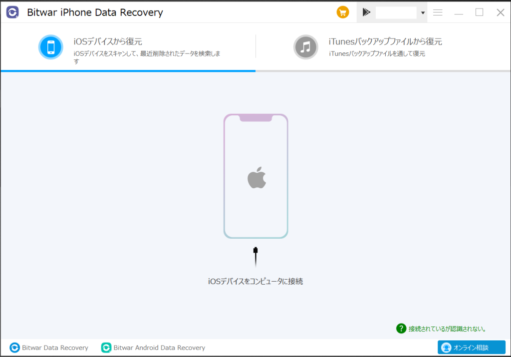 ステップ 2: Bitwar iPhone Data Recovery を起動した後、iPhone をコンピュータに接続し、データ復元中に予期せぬ問題が発生しないように、携帯電話に十分な電力があることを確認してください。