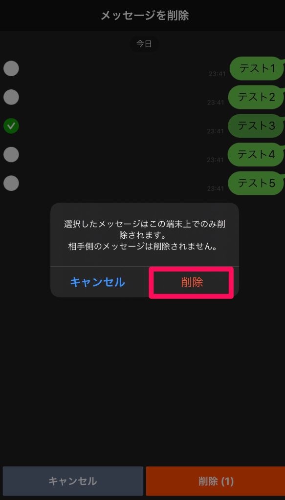 - 個別に削除することを確認した後、下の「削除(数量)」をクリックし、ポップアップウィンドウで「削除」を選択すると、トークルームに残したくないメッセージを個別に削除できます。