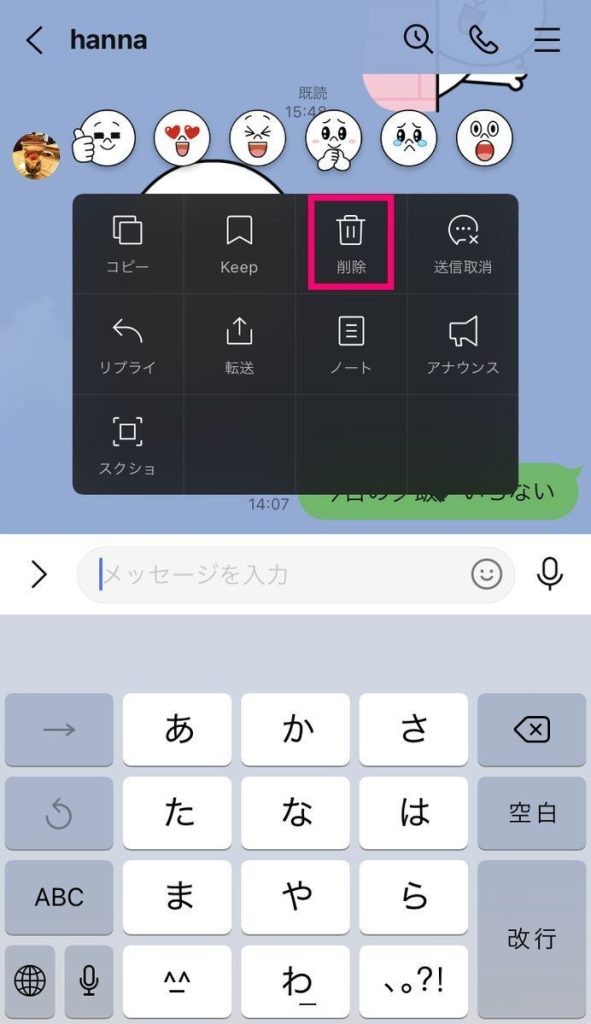 - 削除したいメッセージを長押しした後、「削除」をクリックします。