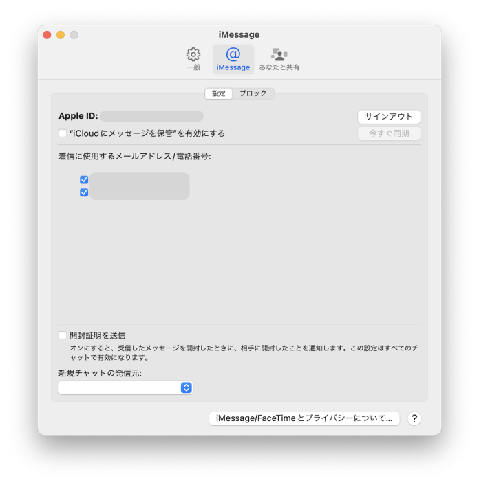 - 次に、上部のメニューバーで「設定」をクリックし、「iMessage」に切り替えて「サインアウト」を選択します。