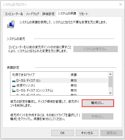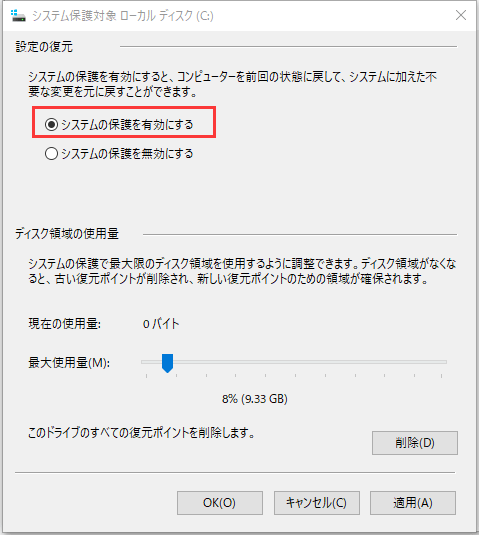 - 「システムの保護を有効にする」を選択し、「適用」、「OK」をクリックします。
